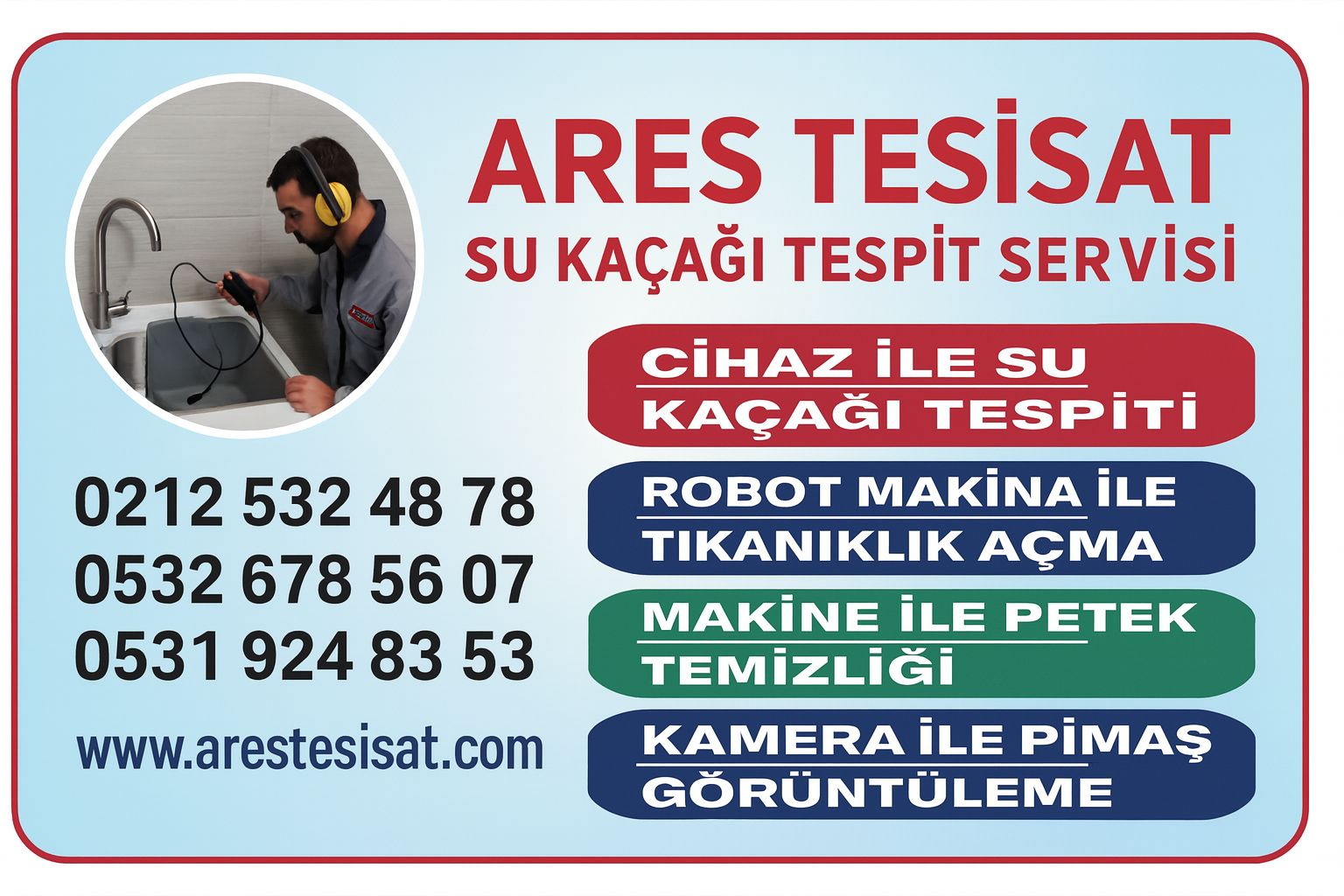 İstanbul Eyüpsultan Su Tesisat Tamirci Servisimizi hemen arayarak her türlü arıza ve problemlerinizden en kısa sürede kurtulabilirsiniz. İstanbul ilinin her bölgesine olduğu gibi Eyüpsultan ve mahallelerine kusursuz hizmet vermekteyiz. İstanbul Eyüpsultan Su Tesisatı Arıza Tamir Servisimiz su arıza tespiti ve su kaçağı tespiti çalışmalarını özel ve teknoljik cihazlar ile yapmaktadır. Su Tesisatı konusunda tecrübeli ustalarımız ile İstanbul Eyüpsultan geneli aramanız durumunda hemen geliriz. Eyüpsultan İstanbul geneli su tesisatçısı için ve tesisat Sorunun tespiti için bizden destek alabilirsiniz. İstanbul Eyüpsultan Su Tesisat Tamirci Servisimiz her arızanızı titizlikle ve kaliteli hizmet garantisiyle tamamlar. Acil su arızalarınız da İstanbul Eyüpsultan su tesisat servisimizden her an destek talep edebilirsiniz. İstanbul Eyüpsultan Tesisat Arıza ustalarımız her türlü arızalarınız için en uygun çözümleri üretmektedir. Pis su kaçağının, telaş edilecek bir sorun olmadığını belirtelim; İstanbul içerisinde Eyüpsultan yanı sıra İstanbul genelinde tüm bölgelere 'Pis Su Kaçağı tespiti' hizmeti sunmakta ve bu konuda çok başarılıdır.